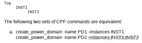 create_power_domain -name PD2 -instances {inst_A inst_B} \-shutoff_condition pse_enable[0] -base_domains PD1