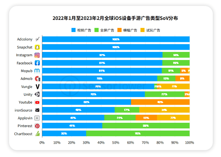 全球手游广告仍以视频广告为主,2022 年 1 月至 2023 年 2 月期间视频广告约占 iOS 设备手游广告总量的 60%。
