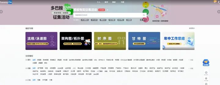 大部分思维导图的软件的使用都很基础,只有简单的几个模板可以使用。但是ProcessOn 已经有自己的模板社区了!模板社区内不仅有官方模板可以使用,更有创作者分享的成百上千的模板可供使用。除此之外ProcessOn的在线协作功能也非常的强大。做完的思维导图一键分享即可。你的小伙伴们就可以与你一起共同编辑你的脑图。