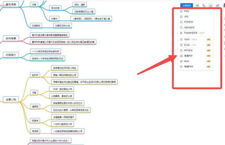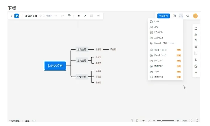 - 思维导图目前支持下载 Word、PPT、Excel、PNG、高清PNG、JPG、SVG、高清PDF、POS、FreeMind、Xmind格式文件,其中部分vip标识的为会员特享功能。