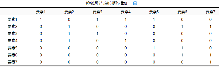 将邻接矩阵与对应的单位矩阵进行矩阵相加,得到上表格矩阵。其目的在于得到‘可达矩阵’。