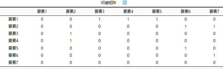 上表格为‘邻接矩阵’即为输入的数据矩阵,其展示要素间的逻辑影响关系情况。数字1代表两要素之间有影响关系,数字0代表两要素之间没有影响关系。右下三角对角线的数字一定为0,因为自己不可能影响自己。