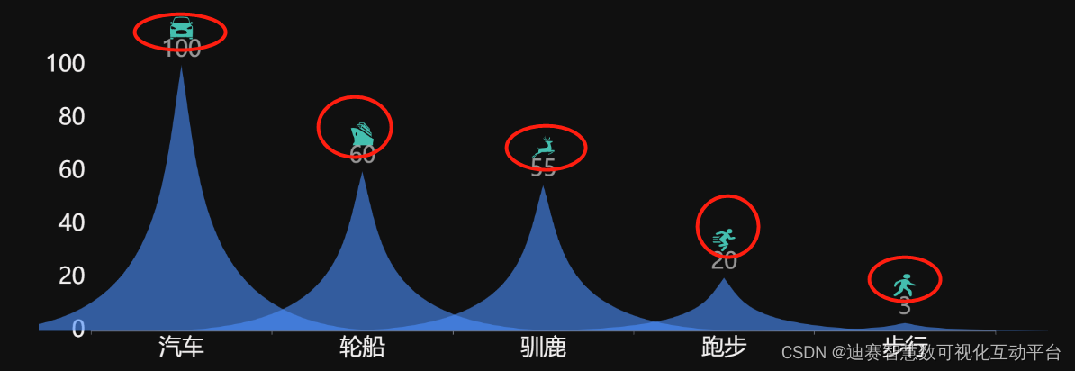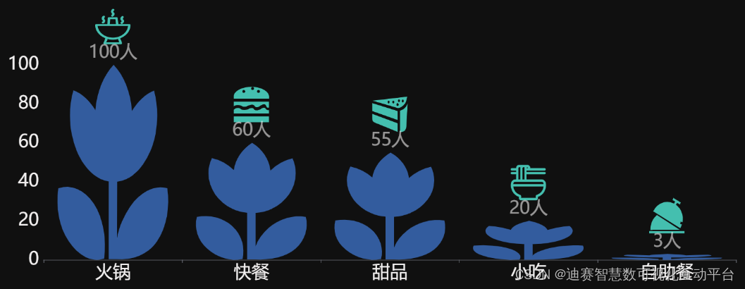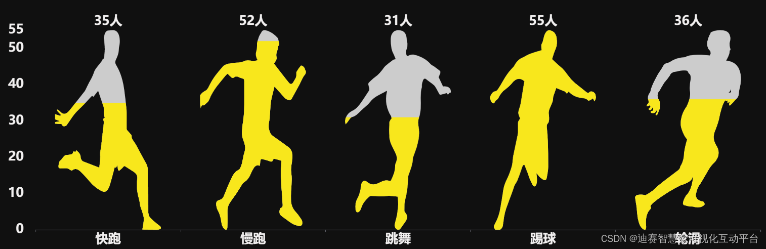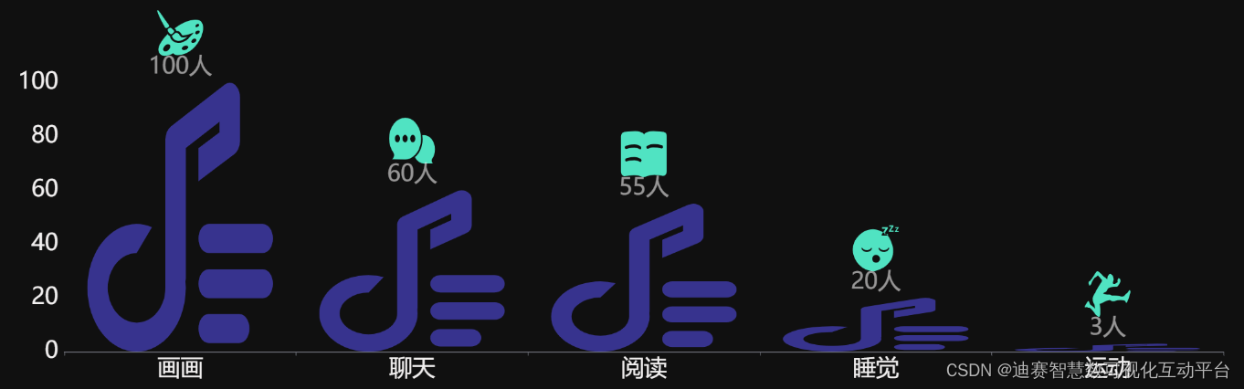 象形动态图,使用图案来显示数据量。使用图案能克服语言、文化和教育水平方面的差异,是更具代表性的数据显示方法。