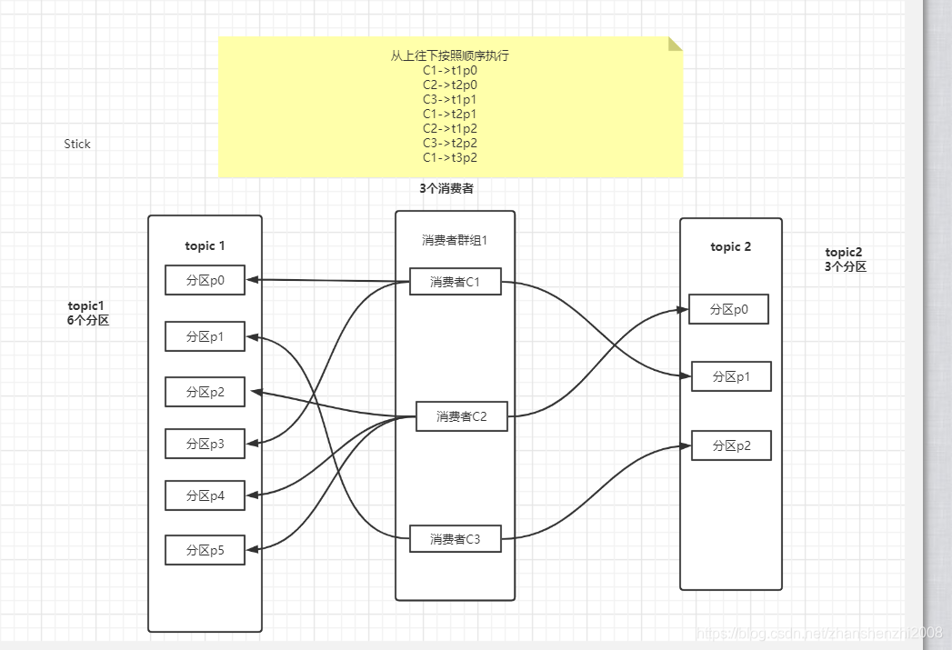 这种只针对消费者订阅主题topic的单个主题topic,也是Kafka的默认分配策略。