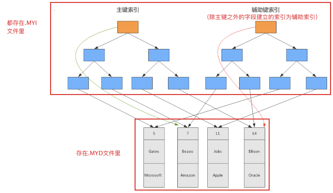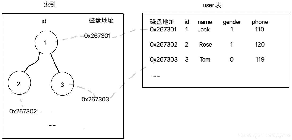 自从有了索引,一切都不一样了。如果在 id 字段建立了索引,id字段的值会被加到索引里,其他字段同理。然后检索的时候,只需要根据 id 的值去检索索引,得到数据的磁盘地址,根据磁盘地址就可以快速地获取到数据。(索引的优点)