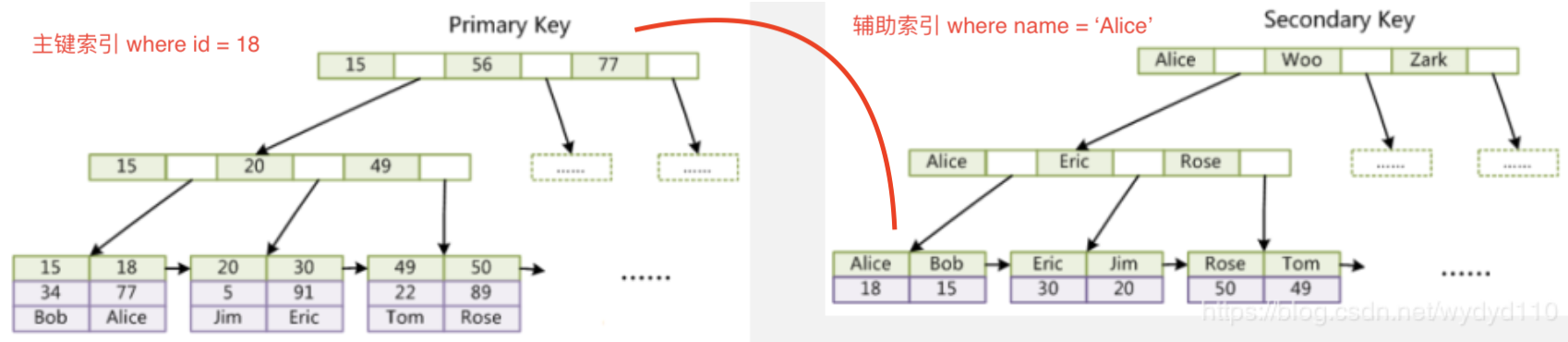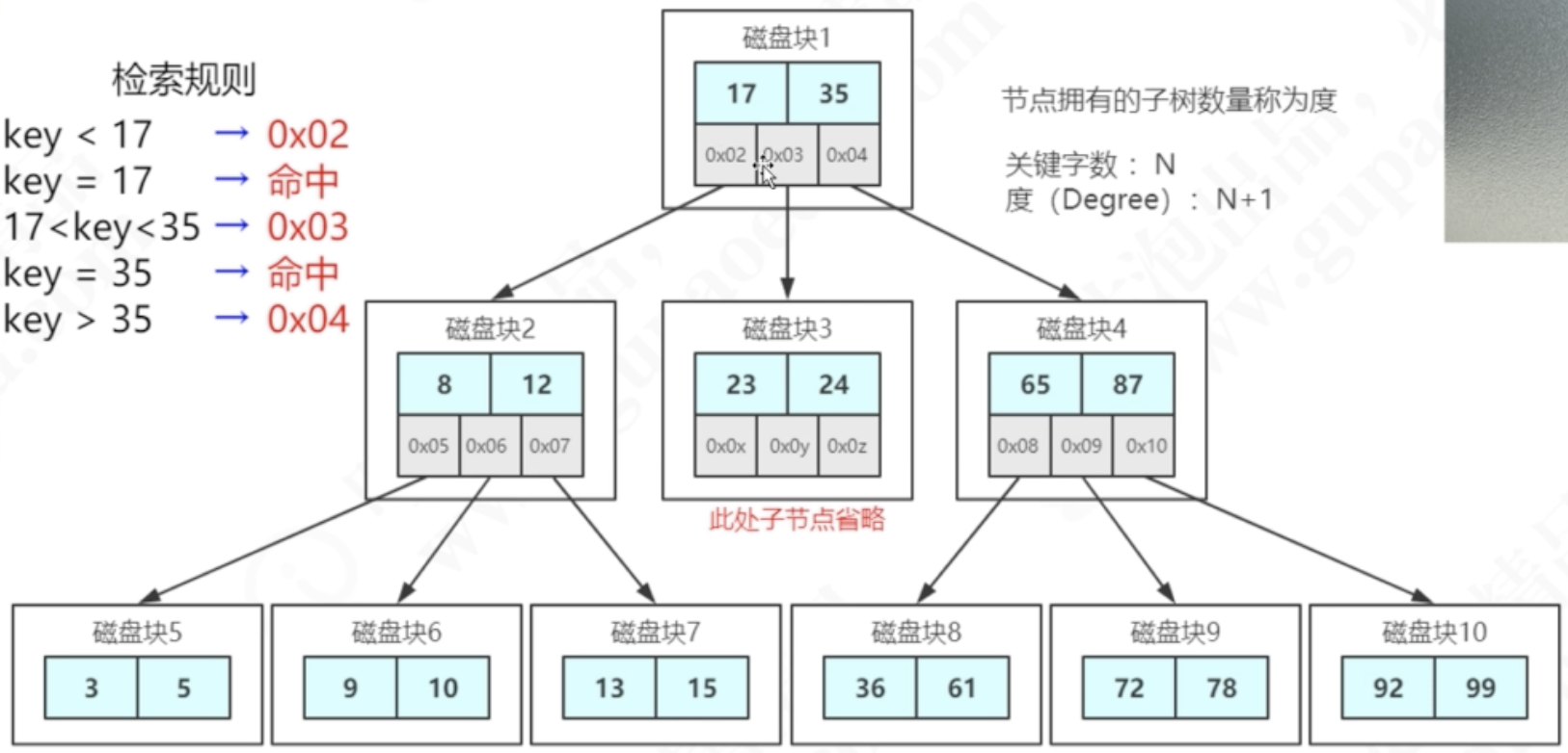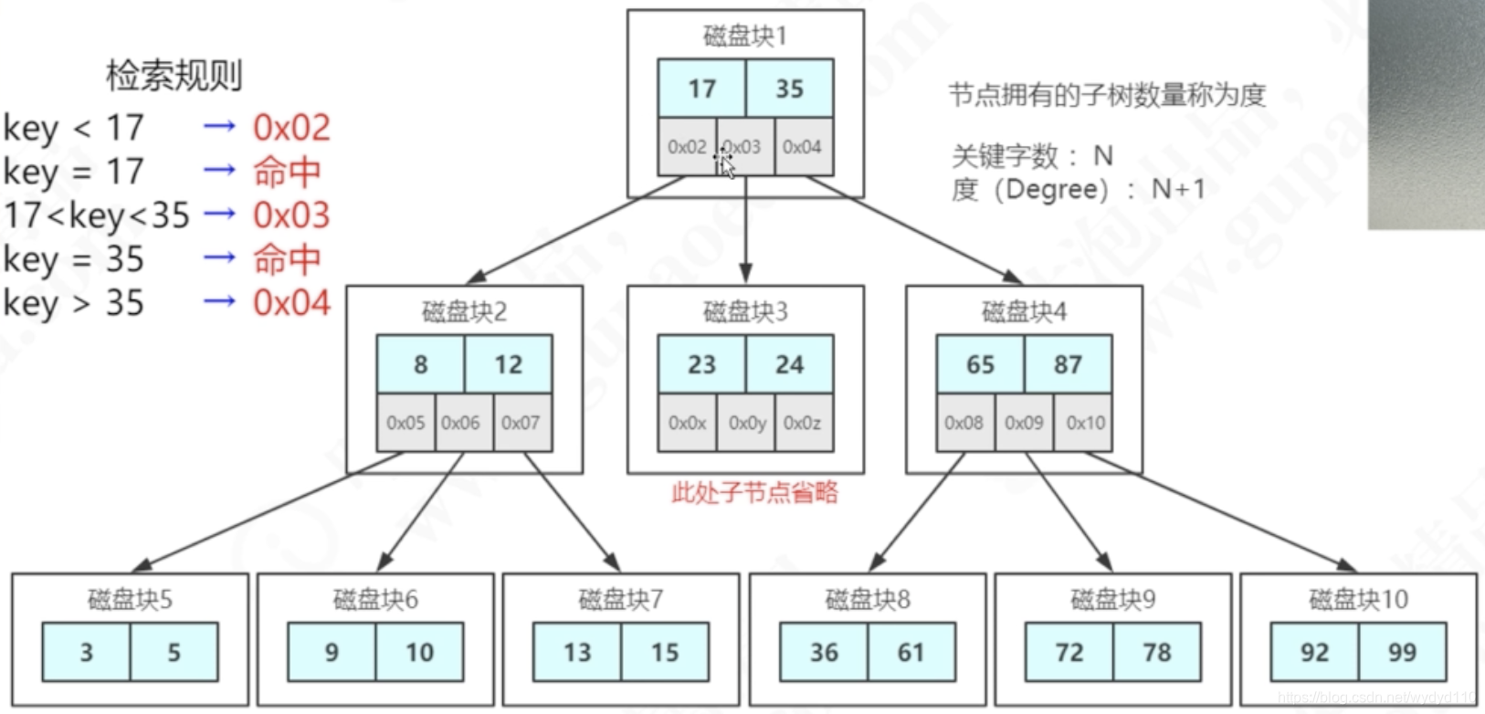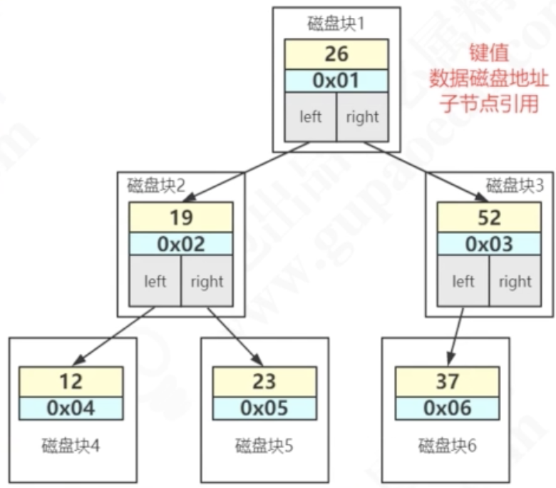 每一个节点占用一个磁盘块,存放键值,完整数据所在磁盘块的磁盘地址,子节点的引用。