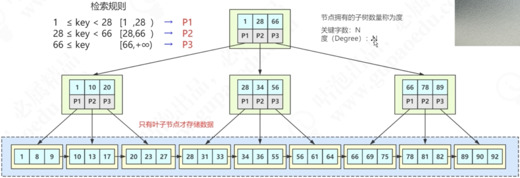 (1)索引值和 data 数据分布在整棵树结构中 (2)每个节点可以存放多个索引值及对应的 data 数据 (3)树节点中的多个索引值从左到右升序排列
