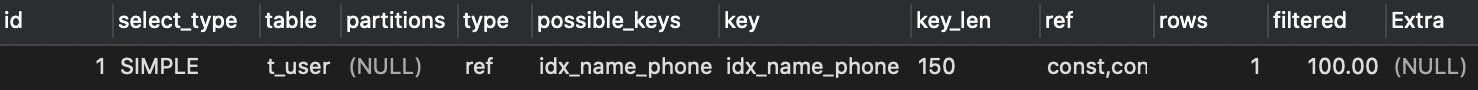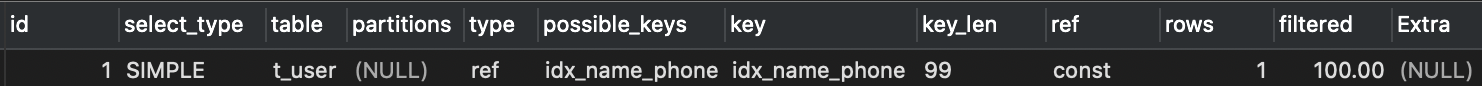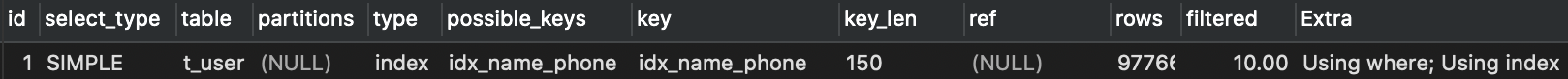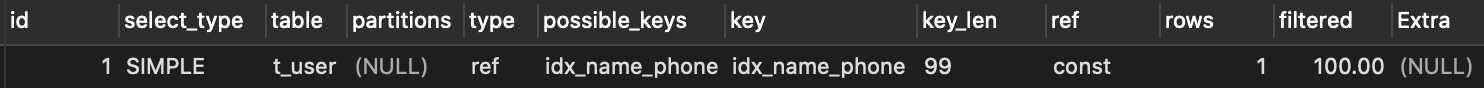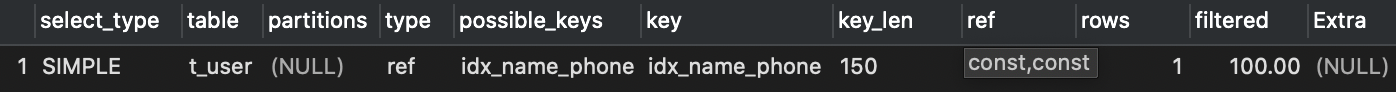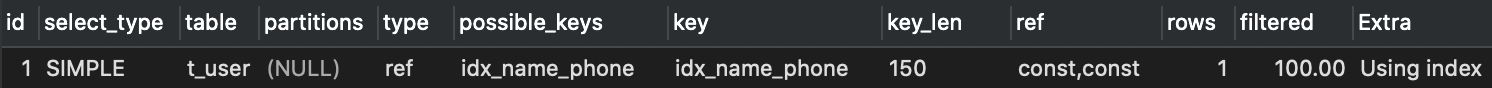 explain select name,phone from t_user where name="屿昔" and phone="15505688900";
