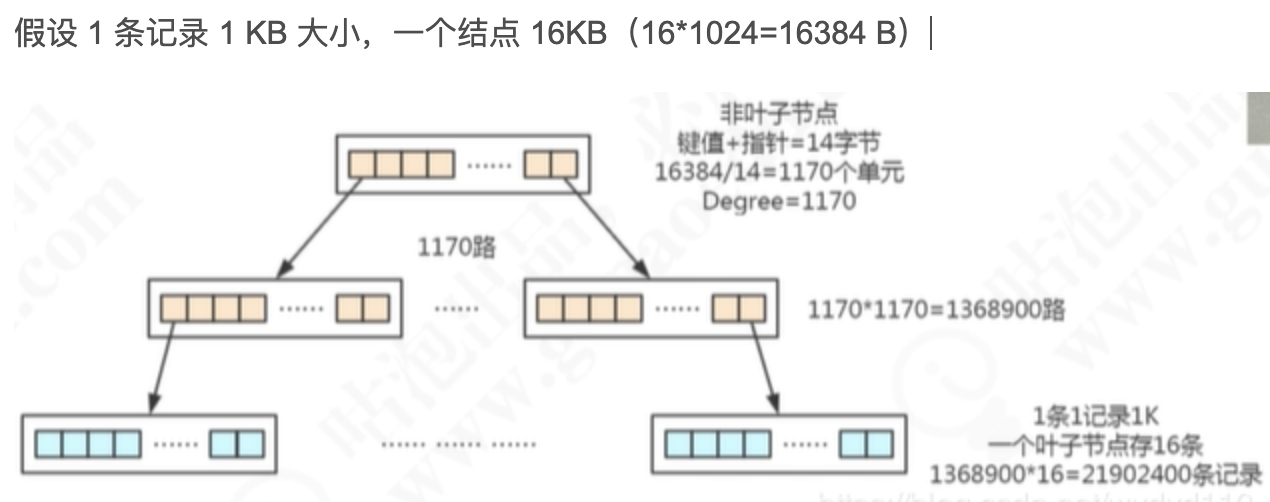 假设 1 条记录 1 KB 大小,一个结点 16KB(16*1024=16384 B)