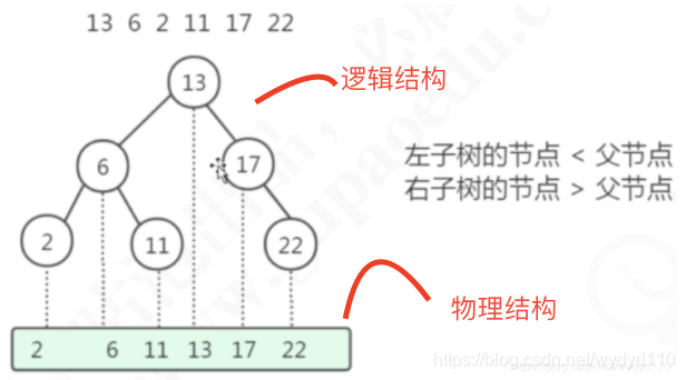上面猜数字的方法可以利用到二分查找思想,而二分查找通常采用二叉树作为逻辑结构,采用顺序存储结构存储在磁盘。