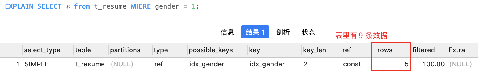 当 extra 出现 Using index 则表示用到了覆盖索引
