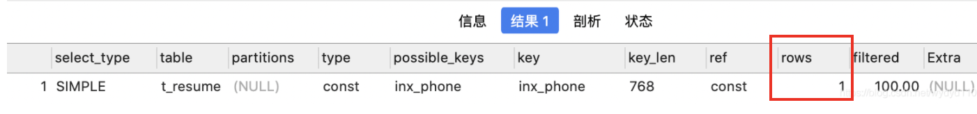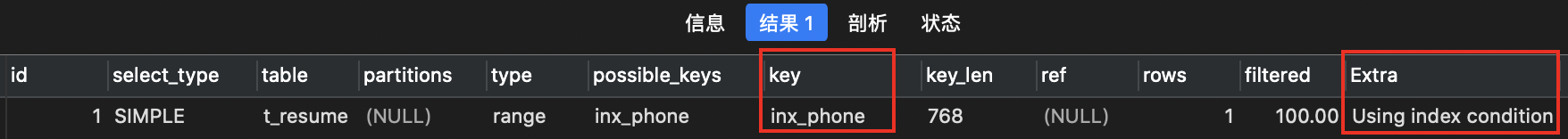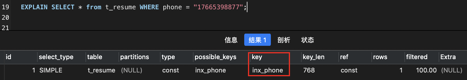 EXPLAIN SELECT * from t_resume WHERE phone like "176%";