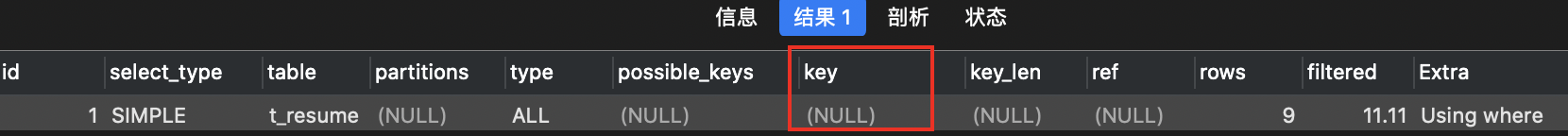 EXPLAIN SELECT * from t_resume WHERE phone like "%176%";