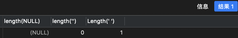 对 MySQL 来说, NULL 是一个特殊的值,从概念上讲, NULL 意味着 “ 一个未知值 ” ,它的处理方式与其他值有些不同。比如:不能使用 = , < , > 这样的运算符,对 NULL 做算术运算的结果都是 NULL , count 时不会包括 NULL 行等,而且 NULL 是占用存储空间的。select length(NULL), length(''), Length(' ');