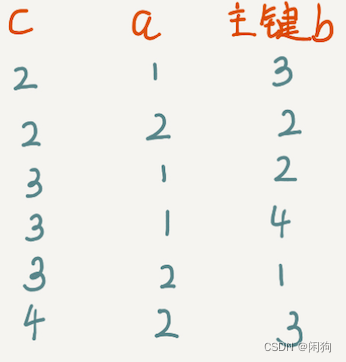 主键 a,b 的聚簇索引组织顺序相当于 order by a,b 也就是先按 a 排序,再按 b 排序,c 无序
