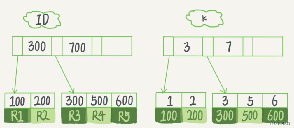 - 在 k 索引树上找到 k=3 的记录,取得 ID = 300;