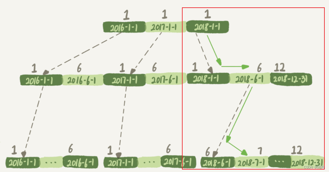 查询条件是 where t_modified='2018-7-1’的话,引擎就会按照上面绿色箭头的路线,快速定位到 t_modified='2018-7-1’需要的结果。