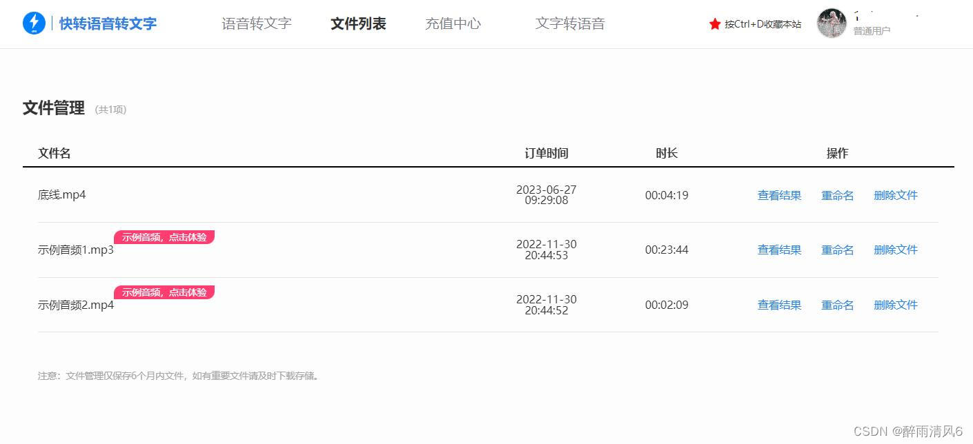第4步:稍等片刻后,在文件列表里可以看到转写完成后的文件,可以查看结果、重命名及删除;