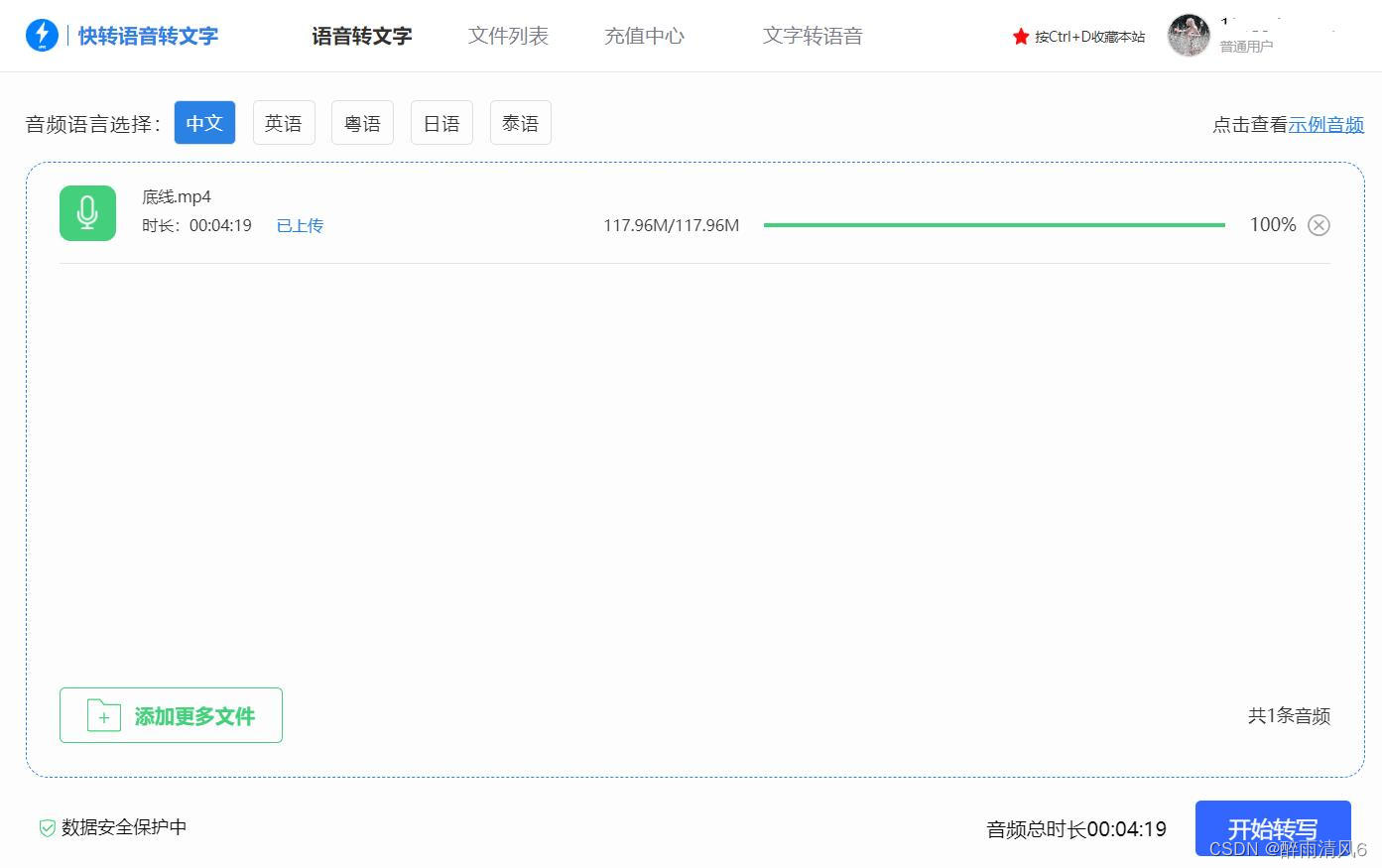 第3步:上传完成后,点击右下角的“开始转写”即开始自动转写,同时进入文件列表;