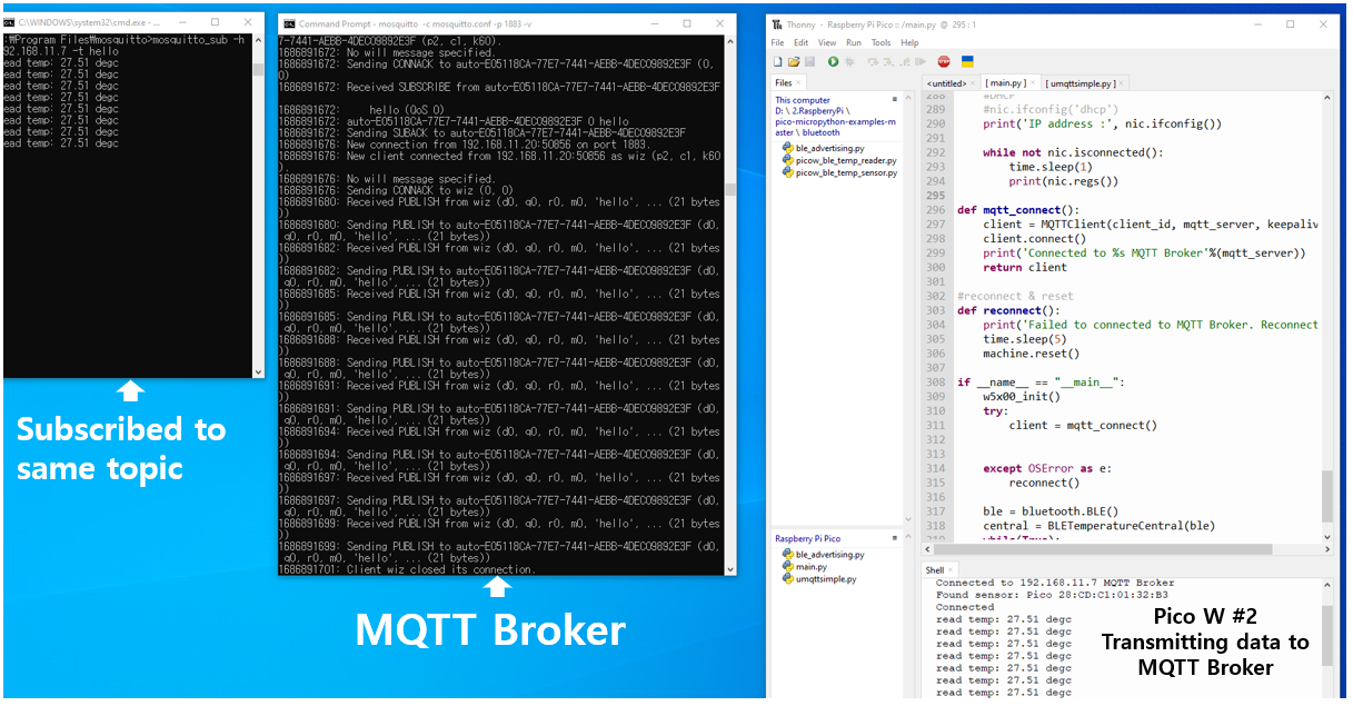 书中有如何将 Pico W 变成 BLE 传感器和中心的示例。 我决定将以太网连接添加到 BLE 中心,并将数据从 BLE 传感器传输到我的 PC 上的 MQTT 代理。