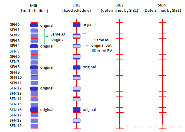 MIB使用40 ms的固定周期,并在40 ms内重复发送。MIB的第一次传输安排在SFN mod 4=0的无线电帧的子帧0中,在所有其他无线电帧的子帧0中重复发送。