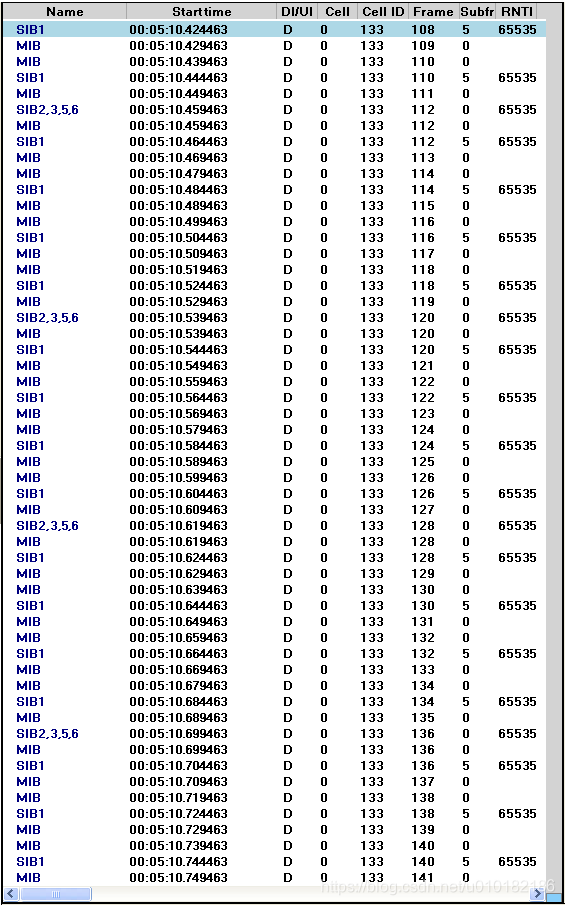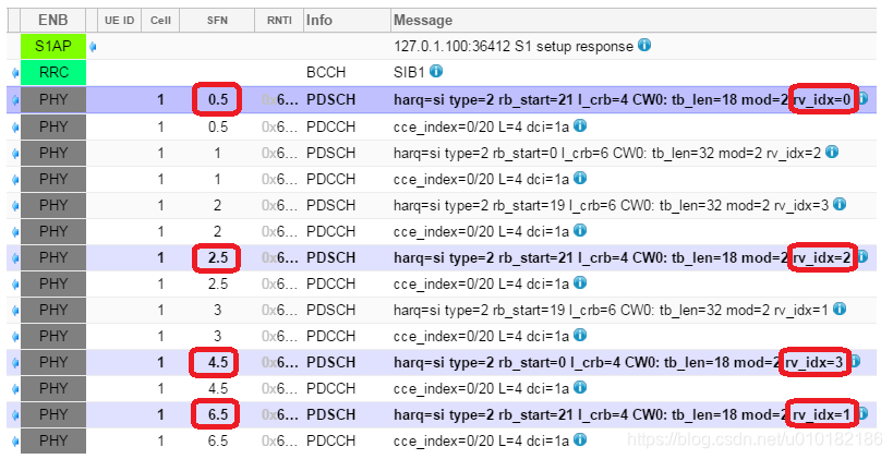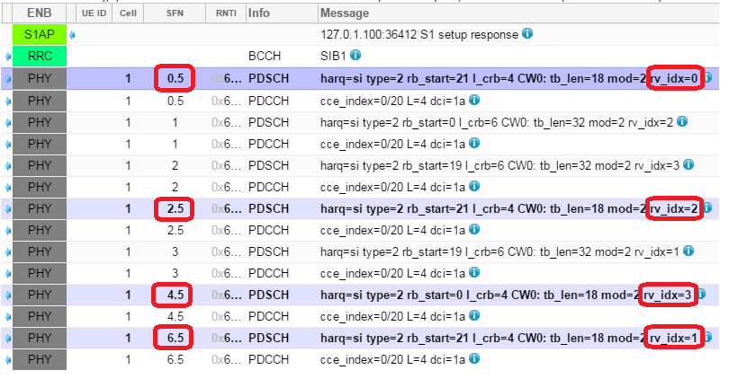 从下面的文本日志中,可以看出的SFN子帧定时和第一次传输以及重新传输(例如SIB1)。