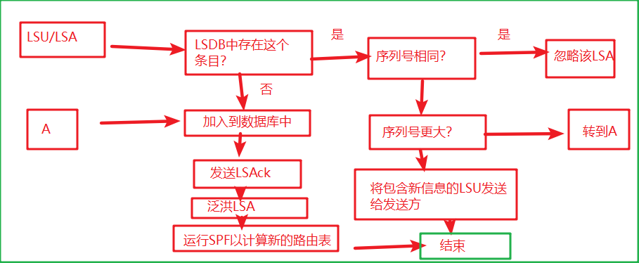4.路由器收到LSU后就后根据它来更新本身的LSDB。定期时间到了之后,对更新后的数据库执行SPF算法,必要时会更新路由表。