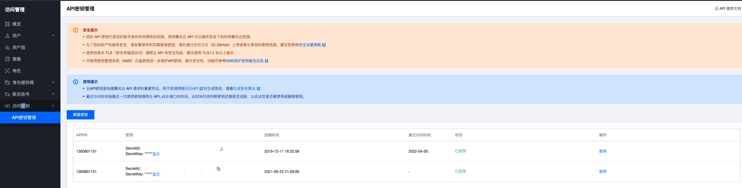 我们需要个人密钥。在腾讯云访问管理的 API密钥管理页面 ,我们新建了个人密钥。