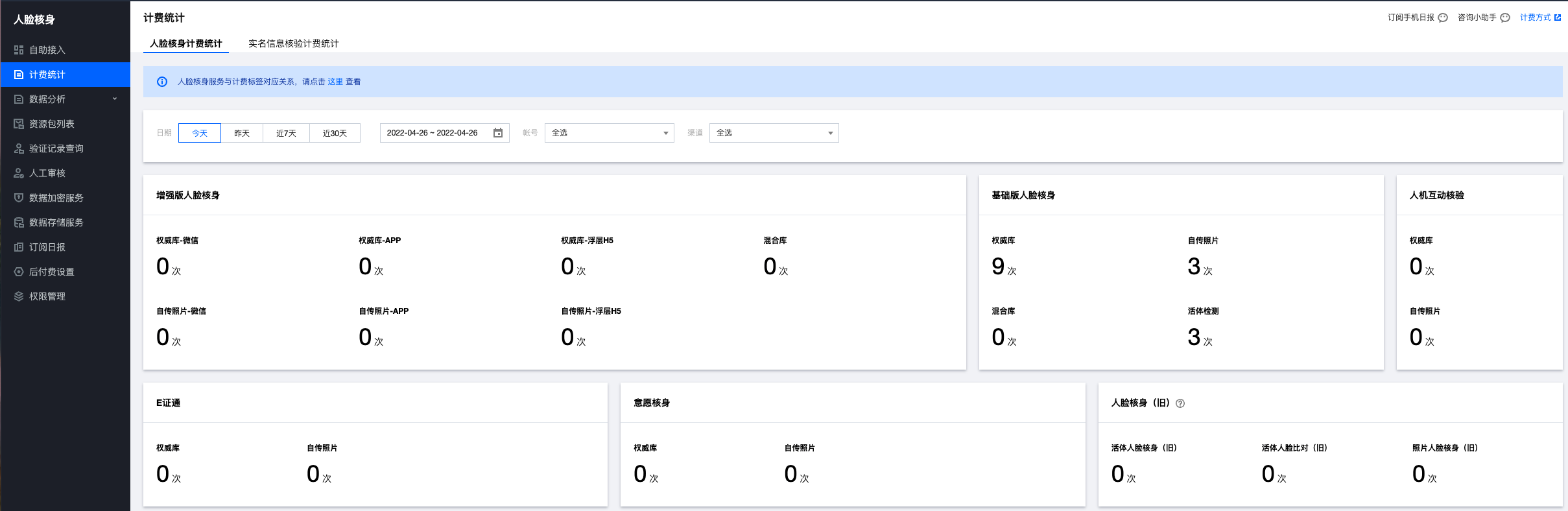 打开腾讯云AI 人脸核身的控制台,点击计费统计,就可以看到意愿核身的计费量情况。