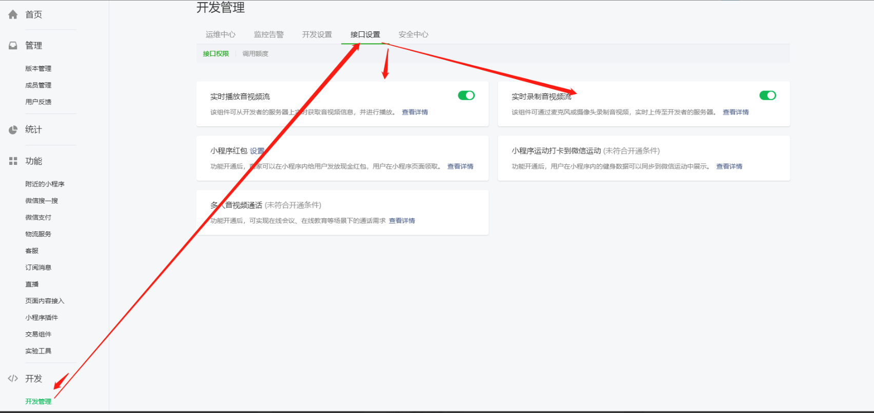 使用腾讯云AI 意愿核身需要开启实时播放音视频流 (live-player) 和实时录制音视频流(live-pusher),所以我们要登录 微信公众平台 开启对应的权限 。