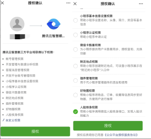 小程序开发需要授权, 打开二维码 ,小程序管理员扫码后,单击自定义权限,只勾选人脸核身权限,将该权限授权给慧眼第三方平台,操作步骤如下图所示: