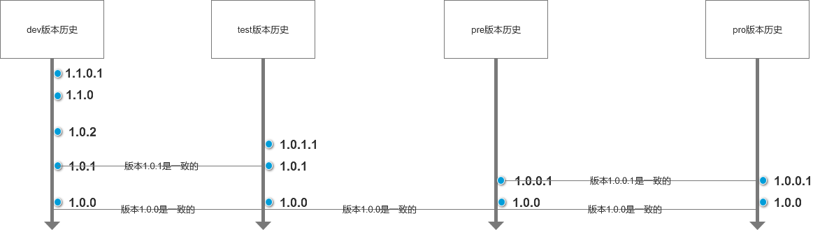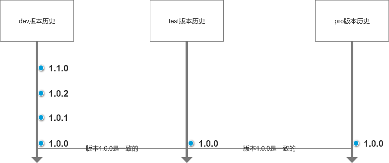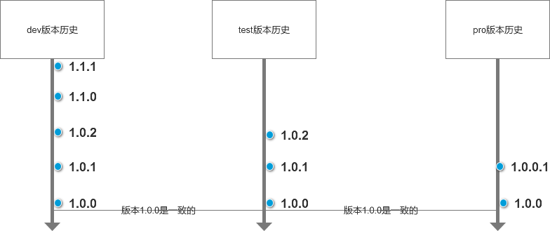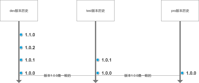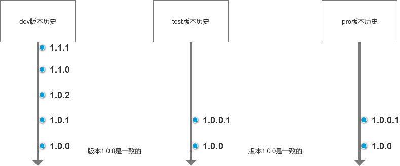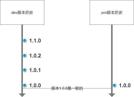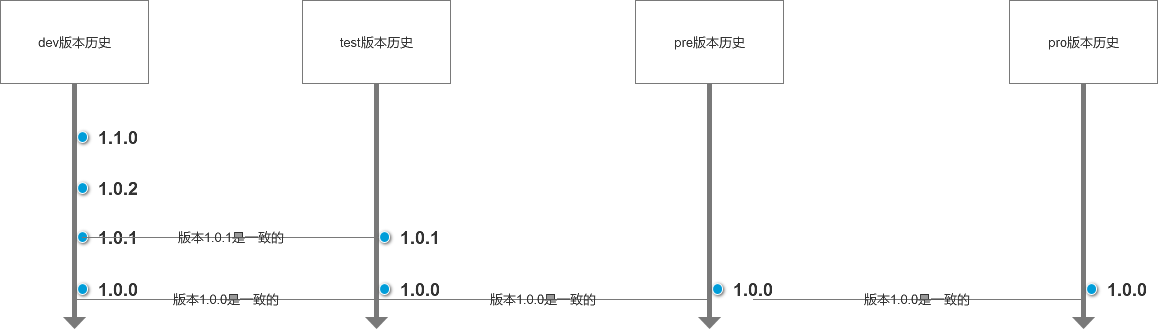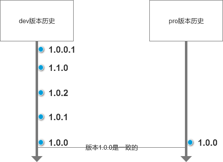 我们只要保证pre的版本和pro环境的版本一致,就可以解决上面的问题了。如上图所示,我们只需要在pre的1.0.0环境上面修复bug就可以了,修复好之后发布到pro环境就可以了,然后将代码同步到test和dev中即可。