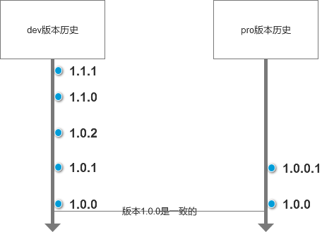 然后测试通过之后,我们需要将1.0.0.1发布到pro环境,然后合并1.0.0.1的代码到1.1.0中,最后将dev环境修改为1.1.1,如下所示: