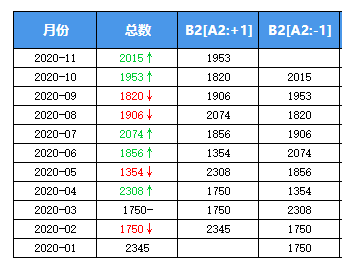 对于B2[A2:+1],绝对层次坐标表示,取出B2当前行的+1行。 A[B] 可以理解为A,B内外两部分,括号外A部分为取出的值所在位置,即我们需要用到的数据所在列;括号内为取出内容所在行的坐标,即如何取到A列数据。 对于A2:+1,A2:-1可以如图比较,以为本行向下比较所以采用了A2:+1: