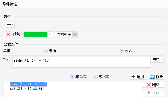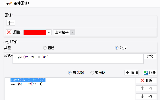 right(A2,2)="01",为了最后一行不比较,取出扩展单元格的右数两位,等于“01”,表示是最后一行;