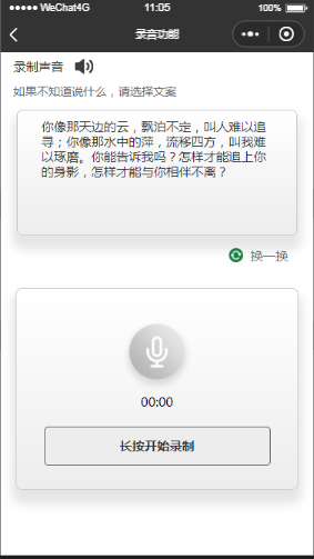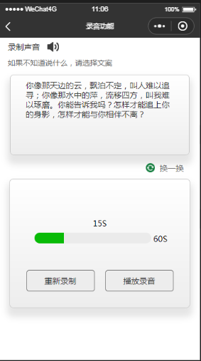Component({properties: {myProperty: {type: String,value: '',observer: function () { }},},data: {// 录制默认idrecuod_id: 1,// 录制时间times: 0,formFile:[],formFileID:2,j: 1, //帧动画初始图片 // isSpeaking: false,//是否正在说话 voices: [], //音频数组 // 默认按住录音recod_name: "长按开始录制",// 默认初始化录制iconrocud_icon: "../../../record/none.png",// 换一换text_value: "你像那天边的云,飘泊不定,叫人难以追寻;你像那水中的萍,流移四方,叫我难以琢磨。你能告诉我吗?怎样才能追上你的身影,怎样才能与你相伴不离?",// 获取到当前录音开始时间start_time: "",// 录制最终时间speck_time: 0,//存储计时器setInter: '',num: 1,list: [],// 文本内容newLists: [{name: "世上最凄绝的距离是两个人本来距离很远,互不相识,忽然有一天,他们相识,相爱,距离变得很近。"}, {name: "不管是晴天阴天雨天,能见到你的一天,就是晴朗的一天;不管是昨天今天明天,能和你在一起的一天,就是美好的一天。"}, {name: "也许上帝让你在遇见那个合适的人之前遇见很多错误的人,所以,当这一切发生的时候,你应该心存感激。"}, {name: "最美好的事是有人爱你,最安心的事是有人信你,最幸福的事是有人陪你,最奢侈的事是有人等你。"}, {name: "你像那天边的云,飘泊不定,叫人难以追寻;你像那水中的萍,流移四方,叫我难以琢磨。你能告诉我吗?怎样才能追上你的身影,怎样才能与你相伴不离?"}],myself_value: [{name: "我曾为时光匆匆流逝而遗憾,曾为生命如此短暂而感伤,曾为花草树木的调残而惆怅,曾为生活的坚信而彷徨,当情海思绪积压我心头的时候,我想寻找一叶扁舟,在大海上游荡,让思绪尽情的释放。"}, {name: "上天给了我黑色的眼睛,我用他来寻找光明,就像向日葵执着的寻找阳光。"}, {name: "都说生活不止眼前的苟且,还有诗和远方的田野,我其实就如不知所谓的鸟儿一样,向着心中火火的朝阳,奋力疾飞,将她放在心中,温暖我余下的整个人生。"}, {name: "既不回头,何必不忘。既然无缘,何须誓言。今日种种,似水无痕。明夕何夕,君已陌路。"}, {name: "我是这样的人读过一些书,呆过几座城。 遇过一些事,爱过几个人。 不爱日出,喜欢晚云。 不求晴好,只享阴凉。 讨厌咖啡,乱品白水。 有过可笑的理想,流过无谓的汗水。 认真思考时少言寡语,头脑空白时喋喋不休。 有别人艳羡的事业,却无自己想要的幸福 一枚凡人,十足情种。 特想变坏,无奈品种。 还有续章,来日方长。"}],recod_color: "#333",},methods: {// 打开getopen(res) {wx.setNavigationBarTitle({title: "录音功能"})this.setData({ShowNones: true})},// 点击换一换btn_change: function (res) {var that = this;for (var i in that.data.newLists) {console.log(that.data.newLists[i].name);//判断是否达到了最后一个,此时数组中的数据没有与输入框中相同的,设置成数组的第一个值if (i == (that.data.newLists.length - 1)) {that.setData({text_value: that.data.newLists[0].name});break;}//如果有相同的数据则换数组的下一个数据if (that.data.newLists[i].name == that.data.text_value) {var num = parseInt(i) + 1;console.log(that.data.newLists[num].name);that.setData({text_value: that.data.newLists[num].name});break;}}},// 完成编辑btn_edit: function () {var loveCardId = 1;var that = this;console.log("card", loveCardId);wx.navigateTo({url: '/pages/make_self/make_self',})wx.stopVoice();clearInterval(that.data.setInter);// 获取到结束时间that.stop();},// 下一步btn_next: function () {wx.navigateTo({url: '/pages/make_self/make_self',})var that = this;wx.stopVoice();clearInterval(that.data.setInter);// 获取到结束时间that.stop();},//手指按下 touchdown: function (e) {var that = this;console.log('touchStart....')wx.getSetting({success(res) {if (res.authSetting['scope.record']) {//第二次才成功授权//将计时器赋值给setInterthat.data.setInter = setInterval(function () {var speck_time = parseInt(that.data.speck_time + 1);that.setData({speck_time: parseInt(speck_time),recod_name: "松开停止录制",recod_color: "#fff",rocud_icon: "../../../record/show.png"});var times = 0;times = speck_time / 60 * 100;console.log("time", times);that.setData({times: times})if (that.data.speck_time > 0 && that.data.speck_time <= 59) {that.start();} else {clearInterval(that.data.setInter);// 获取到结束时间that.stop();that.setData({recuod_id: 2,})wx.showToast({title: '录音最长60S哦!',duration: 2000,icon: "none"})}}, 1000);} else {return;}}})},//手指抬起 touchup: function () {var that = this;console.log("手指抬起了...", that.data.speck_time)clearInterval(that.data.setInter);// 获取到结束时间that.stop();if (that.data.speck_time > 3) {//清除计时器 即清除setInterclearInterval(that.data.setInter);// 获取到结束时间that.stop();that.setData({recuod_id: 2,// isSpeaking: false,recod_name: "长按开始录制",recod_color: "#333",rocud_icon: "../../../record/none.png",})} else {//清除计时器 即清除setInterclearInterval(that.data.setInter);// 获取到结束时间that.stop();wx.showToast({title: '请重新录制',duration: 2000,icon: "none"})that.setData({recuod_id: 1,// isSpeaking: false,recod_name: "长按开始录制",recod_color: "#333",speck_time: "0",rocud_icon: "../../../record/none.png",})}},// 重新录制btn_show: function () {this.setData({recuod_id: 1,speck_time: 0})wx.stopVoice();},//开始录音的时候start: function () {const options = {duration: 60000, //指定录音的时长,单位 mssampleRate: 16000, //采样率numberOfChannels: 1, //录音通道数encodeBitRate: 96000, //编码码率format: 'mp3', //音频格式,有效值 aac/mp3frameSize: 50, //指定帧大小,单位 KB}//开始录音recorderManager.start(options);recorderManager.onStart(() => {cons