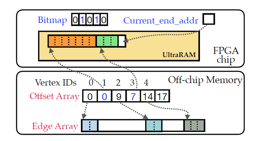 然后,本文提出了一种简单有效的基于位图索引的方法来进行内存寻址。如图5所示,位图中的每一位代表一个顶点,对应位为1代表该顶点的边数据存储在片上,为0代表该顶点的边数据存储在片外。当一个顶点的所有边数据加载到UltraRAM上时,它在位图中的位就被设置为1,并且其在偏移数组中的偏移值被修改为在UltraRAM中的新偏移值。当高价值数据需要被写回片外存储时,需要在偏移数组中计算它们原始的偏移值。具体来说,扫描位图找到需要被写回的顶点v后面第一个为0的顶点