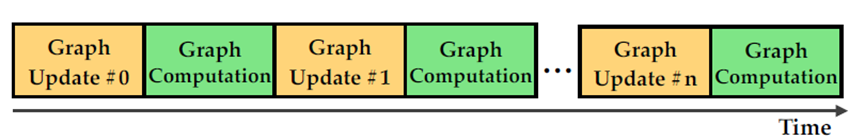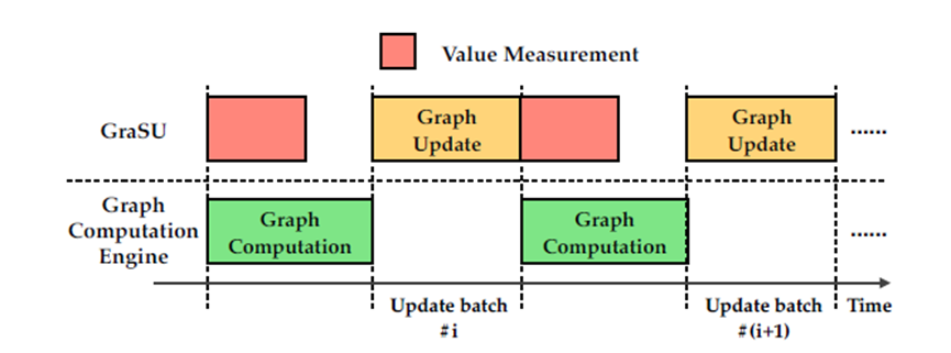 因此,测量一个顶点的价值需要得到顶点的度数和更新频率,而这两个值在图更新时是动态变化的,这会引入潜在的运行时开销。而由于动态图更新和图计算之间的交错性,可以将这个开销隐藏在图计算之中,因为图计算通常需要对顶点进行迭代计算[5],其执行时间会比价值测量的时间要长,如图4所示。