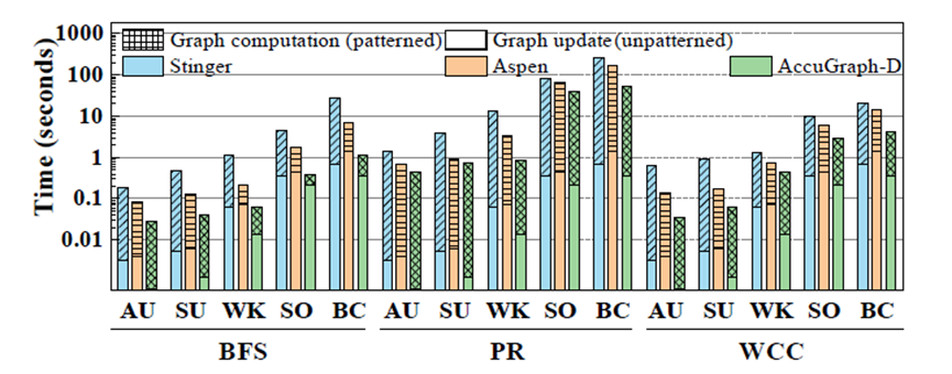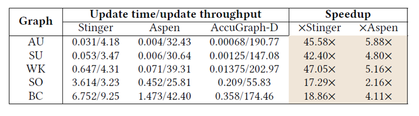 在实验方面,本文使用了Xilinx的U250的FPGA加速卡,并配有64GB的DRAM作为片外存储,在AU,SU,WK,SO [6]和BC [7]五个真实世界动态图上进行实验,对标的基于CPU的动态图处理系统是Stinger和Aspen,测试的算法是BFS、PR和WCC。实验结果如图6和图7所示,图6比较的是图更新的效率,图7比较的是动态图处理整体的效率(包括图更新和图计算)。结果表明本文实现的GraSU系统可以取得更好的性能结果,更多的实验结果和分析可以参考原文。