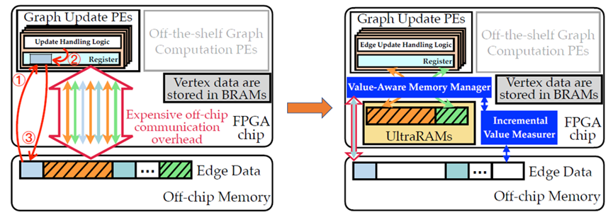 如图2左图所示,使用传统的基于FPGA的图加速器框架实现的图更新框架,顶点通常存储在片上BRAM中,而边数据存储在片外存储上(通常是DRAM)。在这种框架下,图更新操作一般分为三个基本步骤:第一,读取待更新边的源顶点索引,从片外存储加载边表并存储到与PE(图更新处理引擎)相连的寄存器中;第二,将更新的边添加到边表中(或从边表中删除);第三,将边表写回到片外存储。这种图更新处理框架的性能受限于过多的片外通信,因为真实场景下可能存在大量的边更新,使得片外存储上的边数据被PE重复地访问。而本文观察到,其实动态图更新过程中是呈现空间相似性的,即大多数随机访存只与几个顶点的边有关。因此本文重点利用FPGA上差异化的数据管理来将昂贵的片外通信开销转化为快速的片上内存访问。对于每一个顶点,用变量值value来衡量其价值,对于每一批图更新,高价值顶点相关的边数据驻留在片上UltraRAM [1]中,大部分低价值顶点相关的边数据存储在片外,如图2右图所示。而要实现差异化的数据管理,本文需要着重解决两个问题:其一,由于动态图是不断变化的,需要设计一个可以有效衡量value值的策略;其二,由于边数据被分别保存在片上和片外两种存储中,需要设计新的数据寻址机制,保证在FPGA上的时间和空间效率。