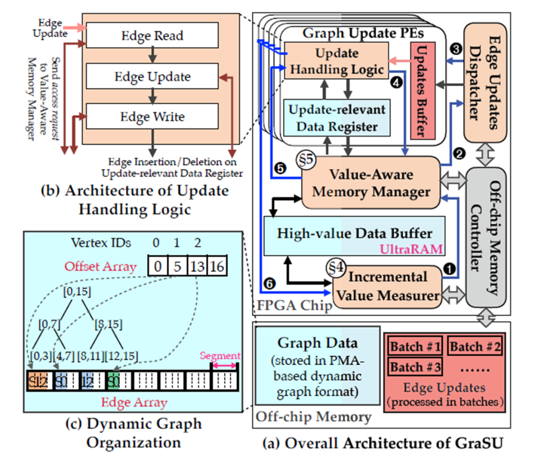 如图3(a)所示,基于FPGA的动态图更新库GraSU的系统框架主要分为五个模块:
