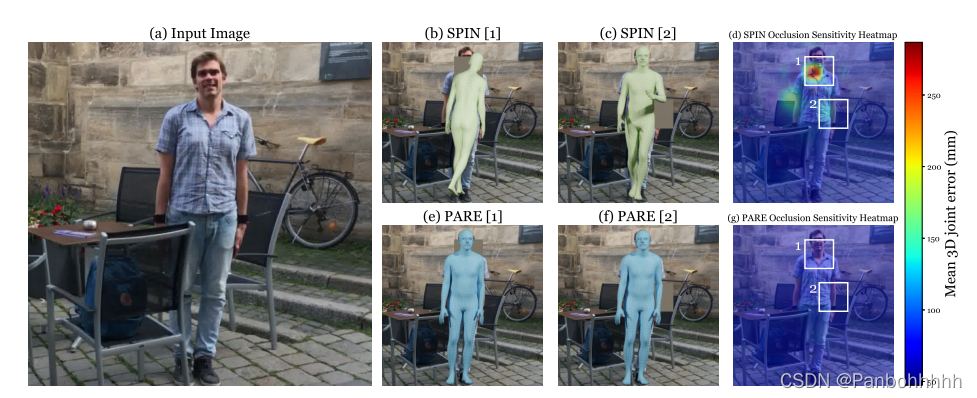 针对遮挡敏感性可视化模型, 使用了优化直接回归方法,论文中提到,首先以端到端的方式回归三维身体参数,学习每个身体部位的注意力权重,然后为了识别或者补全遮挡部分,论文中利用可见部分的像素对其图像特征,来补全图像,达到识别的效果。