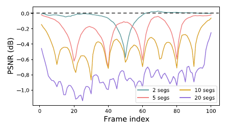 1. 我们证实采用全局传播的重要性。我们从(在时间维度上)全局感受野开始,然后逐渐减小感受野。我们将测试序列分为K个部分,并使用BasicVSR独立还原每个部分。如下图所示,当K减少时,PSNR的差异(对于K = 1的情况)减小。这表明远距离帧中的信息有利于恢复,因此不应忽略。此外,可以观察到,在每个段的两端,PSNR的差异最大,这表明需要采用长序列来积累长期信息。