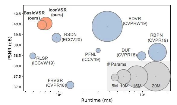 BasicVSR及其扩展IconVSR可以作为将来VSR方法的牢固基线。请参见下图进行比较。值得注意的是,BasicVSR可以推广到各种视频还原任务。我们最近扩展了BasicVSR,并参与了NTIRE2021视频挑战。我们的模型在视频超分辨率和压缩视频增强挑战中获得了两个冠军。为了促进未来的发展,我们发布了代码和模型 MMEditing.