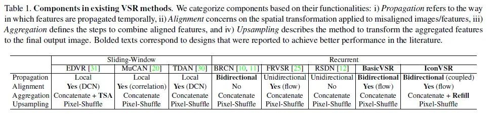 通过我们的研究,我们得出结论,常见的VSR管道可以分解为四个部分:传播,对齐,聚合和上采样。下图显示了一些代表性方法的分解。