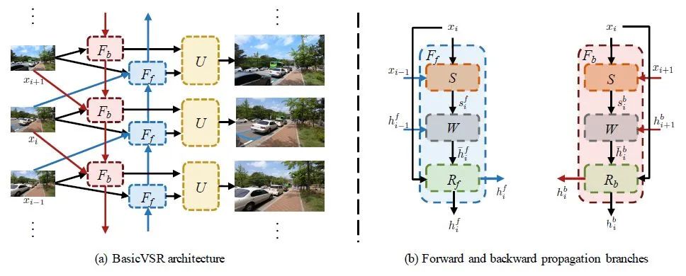 从以上研究中,我们看到选择合适的组件设计的重要性。基于此,我们提出了BasicVSR,它包含了上述设计。在BasicVSR中,我们仅采用通用组件。这种简单性使BasicVSR可以用作强大而又易于扩展的基线。BasicVSR采用双向传播来充分利用视频序列中的信息,并使用光流进行特征对齐。然后,使用残差块对对齐的特征进行汇总,并通过pixel-shuffle对其进行上采样。