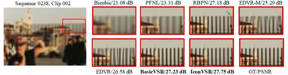 我们在四个数据集上,两个退化上测试BasicVSR和IconVSR。我们看到,没有复杂的模槐,BasicVSR就已经可以在多个数据集上胜过现有技术。借助我们提出的部件,IconVSR可以进一步提高性能,并在大多数数据集上实现最先进的性能。以下结果表明,BasicVSR和IconVSR通过利用长期信息成功地重建了细节。