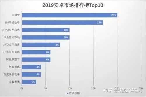 据调查显示在中国第三方移动应用商店用户中,首先使用应用宝占比达到20%左右,其次360占比17%,手机硬件厂商oppo、华为、vivo、小米等紧随其后,阿里系、历趣、百度等应用市场势均力敌,在呈现阶梯状递减的趋势下差别并不是很大。