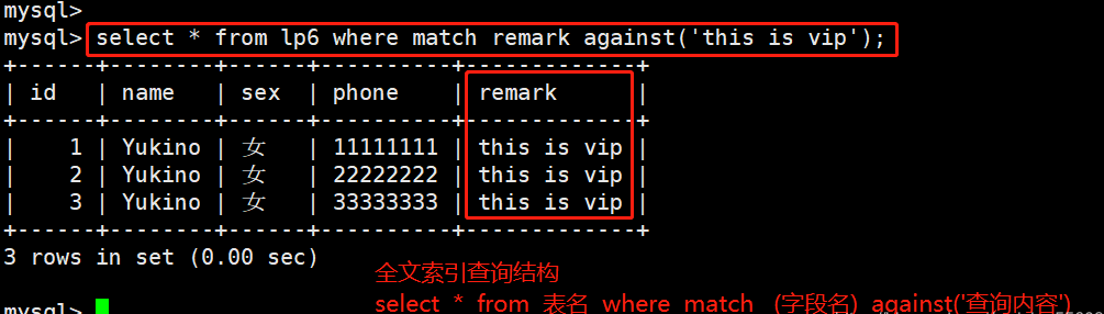 select * from member where match(remark) against('vip');