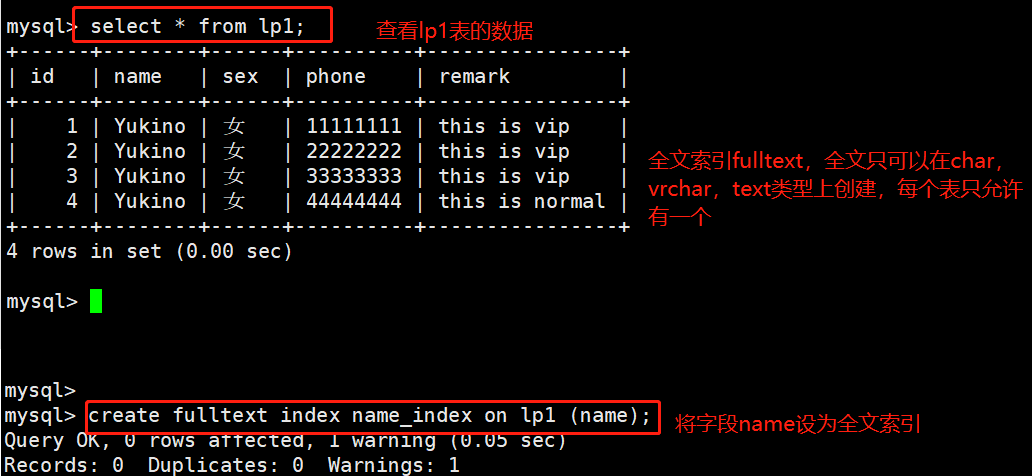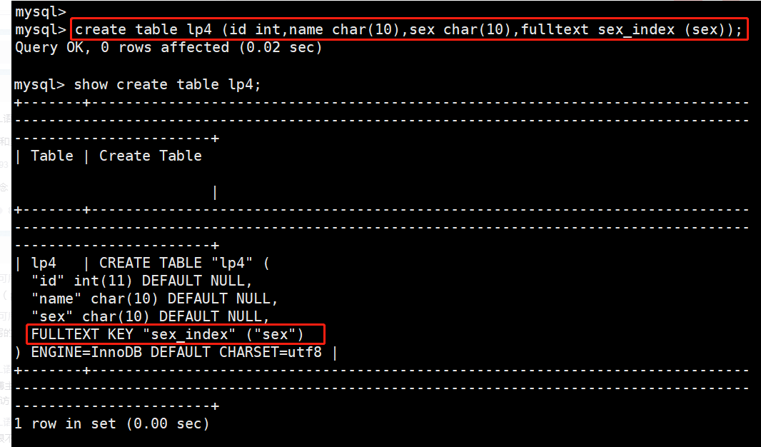 CREATE TABLE 表名 (字段1 数据类型[,...],FULLTEXT 索引名 (列名));